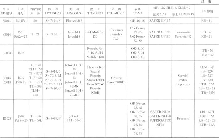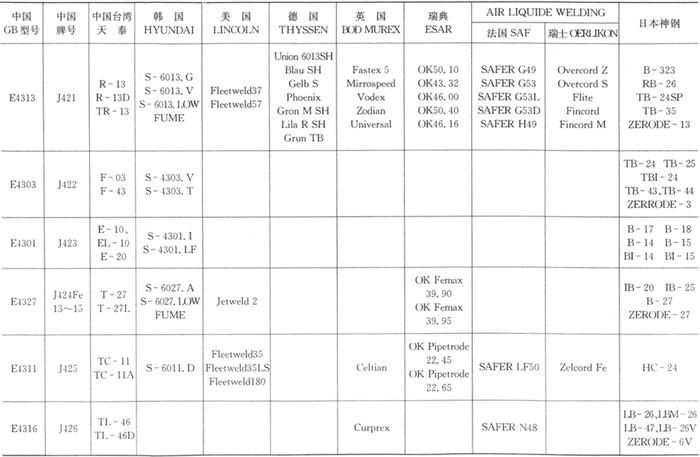 国内外常用碳钢焊条标准和常用焊条牌号见表1.2-16、1.2-17。 表1.2-16 国内外常用碳钢焊条标准型号对照表