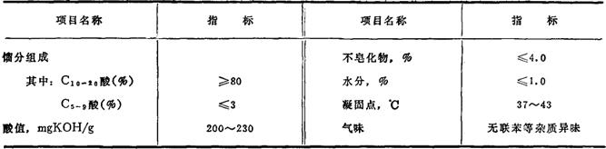 | 释义 | 合成脂肪酸C14~19酸 别名 优质皂用酸 结构式 CnH2n+1COOH(n=13~18) 分子量228~298 性能 在常温下为白色或微黄色猪脂状固体,微有合成脂肪酸的特殊气味。不溶于水,溶于有机溶剂。具有有机酸的化学通性。 质量规格(大连油脂化学厂)