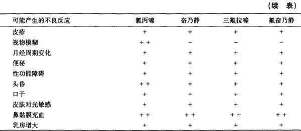 | 释义 | 吩噻嗪类 【适应证】本类药适用于治疗急、慢性精神分裂症、躁狂症、反应性精神病及其他重症精神病的对症治疗,可控制兴奋、攻击、幻想、思维联想障碍及情绪冲动、木僵等症状。不适用于伴随意识障碍而产生的精神异常。小剂量的氯丙嗪、奋乃静或三氟拉嗪也能制止呕吐。 【药理作用】抗精神病的效应系由于在脑内阻断多巴胺受体而致。此类药物还可产生α-肾上腺素受体阻断作用,并可影响下丘脑与脑垂体的内分泌。其镇静作用系由于抑制脑干网状结构的上行激活系统。抑制呕吐系由于影响了延髓的呕吐中枢的活动而致。 【药代动力学】口服后,各种吩噻嗪类药物吸收状况不一致。肌内注射比口服的生物利用度高4~10倍。这类药及其各种代谢降解产物主要分布于脑,其次为肺与其他组织,并可通过胎盘屏障进入胎血循环。具有高度的亲脂性与高度的蛋白结合率。单次给药作用可维持24h。与蛋白结合的吩噻嗪类药及其代谢降解产物排泄缓慢,即使停药已数月,仍可在血或尿内测得。本类药物主要自肾随尿排出。胎儿、婴儿与老龄病人对这类药物的代谢与排出均明显降低。 【不良反应】4种吩噻嗪类药物的不良反应如表12-1所示。 表12-1 4种吩噻嗪类药物不良反应的比较