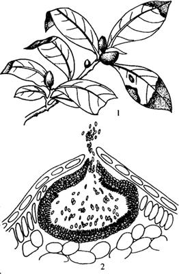 1.症状 2.病原菌的分生孢子器及分生孢子