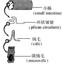 | 释义 | 吸收 三大营养物质通过消化酶的作用被分解为小分子物质后即可被吸收。 (一)吸收的概述 1.吸收的部位 消化管不同部位的吸收能力和吸收速度不同,这主要取决于各部消化管的组织结构、食物被消化的程度和停留的时间。在口腔和食管内,食物停留时间短,未被充分消化,所以不被吸收,但口腔黏膜可吸收某些药物,如亚硝酸甘油等。胃只吸收酒精和少量的水。大肠主要吸收水和无机盐。小肠是营养物质吸收的主要部位。钙、镁、铁主要在十二指肠内被吸收。糖类、蛋白质和脂肪的消化产物及维生素、水和无机盐主要在十二指肠和空肠被吸收。回肠有其独特的吸收功能,它可主动吸收胆盐和维生素B12。对于大部分营养物质,当它们到达回肠时,通常已被吸收完毕,因此回肠主要是吸收机能的贮备。 小肠之所以成为营养物质吸收的主要场所,是因为它具有一些有利条件:①吸收面积大。人的小肠约5~7米长,并具有独特的组织结构。小肠黏膜形成许多环形皱襞(plicae circularis),皱襞上有大量的绒毛(villi),绒毛上皮细胞的顶端又有许多微绒毛(microvilli)。环状皱襞、绒毛和微绒毛使小肠黏膜的表面积增大600倍,达到200~250m2左右(图9-58)。②绒毛内有丰富的毛细血管和淋巴管(中央乳糜管)。绒毛平滑肌的收缩和舒张可使绒毛做伸缩运动和摆动,促进血液和淋巴液的回流,有助于吸收。③食物在小肠内已被消化为可被吸收的成分。④食物在小肠内停留时间长,一般为3~8小时,有足够的时间充分消化、吸收。