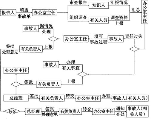 说明 1.事故发生后,办公室主任一方面审查事故报告,与知情人了解情况,另一方面派人调查根据调查报告,做出决定: (1)属一般责任过失,在办公室主任权限内,办公室主任便可做决定;属严重责任过失,办公室主任上报有关负责人签批处理决定,如事故重大必须报总裁签批有关事故处理意见。 (2)属非责任过失在办公室主任权限内,办公室主任可处理,如超过出权限外,办公室主任上报有关负责制签批处理意见。如超出有关负责人权范围外,必须呈报总经现签批处理意见。 2.责任过失与非责任过失界定及处理权限见《奖惩条例》。 |