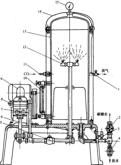 1-放气阀 2-碳酸水出口阀 3-安全阀 4-放水阀 5-止回阀 6-水泵进水管 7-水泵出水管 8-压力调节阀 9-柱塞泵 10-液位计 11-二氧化碳气进口 12-雾化喷嘴 13-贮液桶 14-外壳 15-压力表