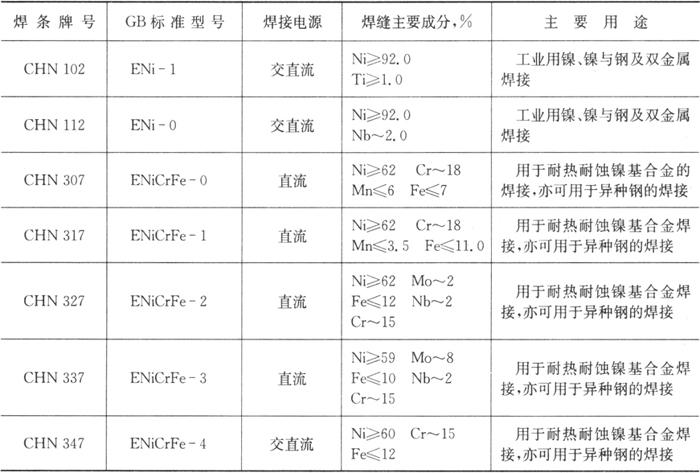 四川大西洋焊接材料股份有限公司生产的主要镍及镍合金焊条性能及用途见表5.7-8。