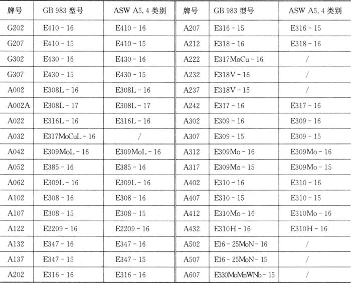 | 释义 | 国内外不锈钢焊条的牌号、型号和标准号 由于我国在1995年后已采用美国ANSI/AWS A5.4中的类别号(型号)作为GB 983中的不锈钢焊条型号,并将标准号改为GB/T 983-1995,这样就使两个标准基本上等同起来。日本JIS Z3221不锈钢焊条标准也直接采用AWS类别号,只是在焊条型号的三个数字前加“D”而不是加“E”,如JISD308L-16,JIS D316-16等。韩国的KS标准也采用AWS类别号,只在焊条型号的三个数字前加“D”,如KS D308L-16,KS D316-16等。在德国DIN 8556标准中采用E199ncR26表示E308L-16。而ISO3581标准则以E19.9LR23表示E308L。 不锈钢焊条的牌号基本上也采用型号的表示方法,冠以不同的字头或后缀,如美国Lincoln公司的E308L-16型焊条的牌号有Stainweld 308L或308LMR等;日本神钢的D308L16型焊条的牌号有HIMELT-308L、NCA308L或NC-38L等;日本新日铁公司的D308L16型焊条的牌号则为NITTETSU 308LR;韩国HYUNDAI公司的D308L-16型焊条的牌号为S308L-16N;荷兰FILARC公司的E308L-16型焊条的牌号则为Filarc RS308LC;德国TYSSEN公司的E199ncR26(即E308L-16)型焊条的牌号为Phoenix 4316W,与其他公司的表示法完全不同。 我国(出E308L-16型焊条的牌号一般有两种名称,一是沿用原有的牌号,如A002,另一种是同样在E308L前冠以公司的代号,如SH.E308L、AT E308L或TS-308L等。 表3.2 8列出我国沿用的不锈钢焊条牌号与型号的对照。 表3.2-8 我国常用不锈钢焊条牌号与GB 983-1995焊条型号及AWS A5.4-1992类别对照