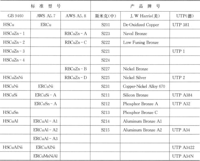| 释义 | 国内外主要铜及铜合金焊丝对照 美国铜及铜合金焊丝标准与我国不同,按焊接方法曾分为两个。ANSI/AWS A5.7-1984《铜及铜合金焊丝和填充丝》规定等离子弧焊,熔化极惰性气体保护电弧焊(MIG)及钨极惰性气体保护电弧焊(T1G)用的铜及铜合金焊丝;AWS A5.27-1978《铜及铜合金气焊丝》规定气焊(含钎焊)用的铜及铜合金焊丝,1980年并入了AWS A5.8《钎焊和钎接焊填充金属》标准。 国内外铜及铜合金焊丝的标准型号和典型公司产品牌号对照列于表8.3-2。 表8.3-2 铜及铜合金焊丝型号和牌号对照表