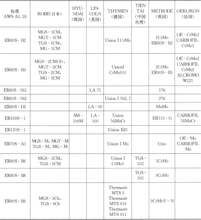 表2.3-10 国内外低合金钢气体保护焊焊丝牌号对照表