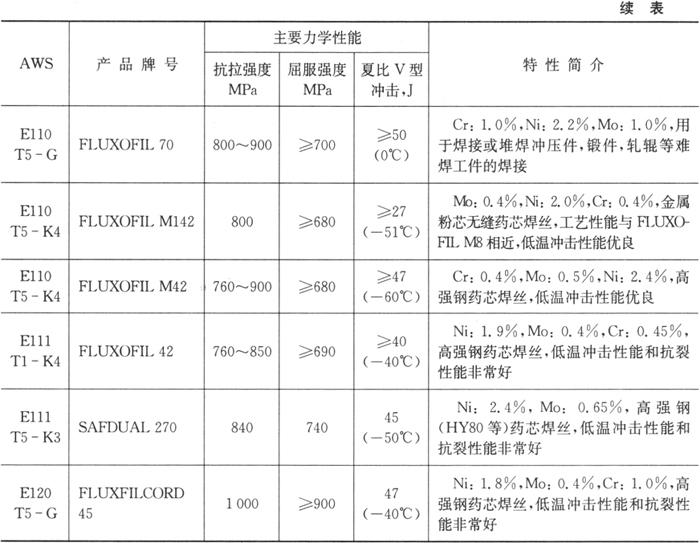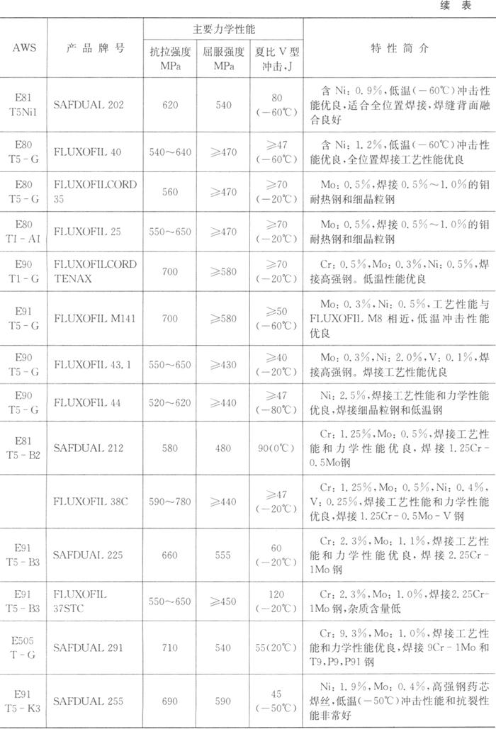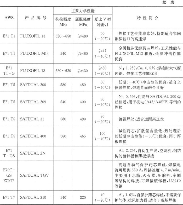 | 释义 | 国内外碳钢药芯焊丝介绍 1.国产碳钢药芯焊丝 国产碳素结构钢药芯焊丝的牌号、特征和用途列于表1.4-10。 2.SAF-OERLIKON公司的药芯焊丝 法国SAF-OERLIKON公司提供熔化极气保护(MIG/MAG)药芯焊丝包括药剂型药芯焊丝和金属粉型药芯焊丝,有缝和无缝镀铜药芯焊丝,自保护药芯焊丝,低尘和低噪声环保型药芯焊丝。该公司生产的药芯焊丝列于表1.4-11、1.4-12。 表1.4-11 SAF-OERLIKON生产的碳钢气保护(MIG/MAG)药芯焊丝的牌号及特性