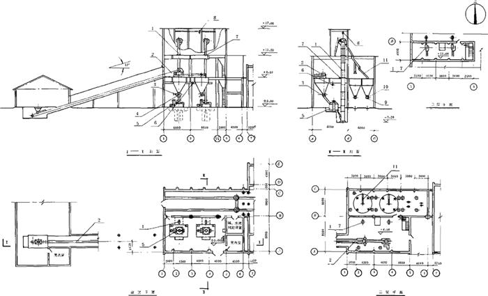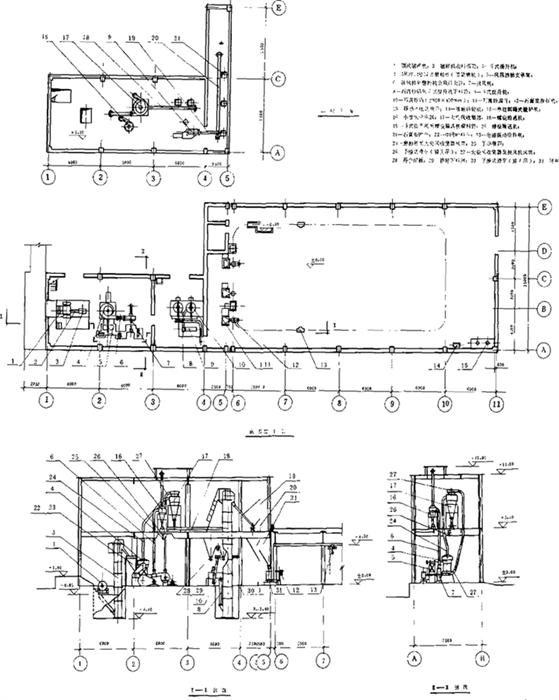 1-斗式提升机;2-胶带输送机;3-螺旋闸;4-电磁振动给料机;5-盘转上传动式石轮碾机(LN1120×300);6-描头吊(手拉式葫芦);7-斗式提升机楼板固定装置;8-描头吊;9-下料阀、10-配料仓闸板;11-回转溜子(Ⅰ)