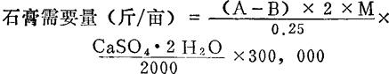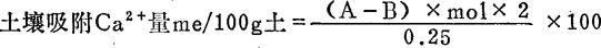 式中:A——滴定5ml石膏饱和溶液需要0.01molEDTA的毫升数; B——滴定5ml土壤滤液需要0.01molEDTA的毫升数; mol——EDTA的克分子浓度; 2——将钙或镁的毫摩尔数换算成毫克当量数; 0.25——土样重(g)。 当(A)<(B)时,说明土壤中原含有较多的Ca2+和Mg2+,那就不需要施用石膏。
