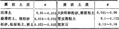 式中 S——沉陷量(cm); p——有效作用力,对容量6~8m3的铲运机按0.6MPa计算,对100马力推土机按0.4MPa计算; c——土的抗陷系数(MPa),见表17-94。 表17-94 各种不同原状土c值参考表