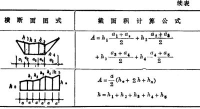 注:①a为方格网的边长(m);b,c为零点到一角的边长(m);h1、h2、h3,h4为方格网四角点的施工高程(m),用绝对值代入;∑h为填方或挖方施工高程的总和(m),用绝对值代入;V为挖方或填方体积(m3)。 ②本表公式是按各计算图形底面积乘以平均施工高程而得出的。 2.常用横截面法计算公式(表17-96) 表17-96 横截面法计算公式
