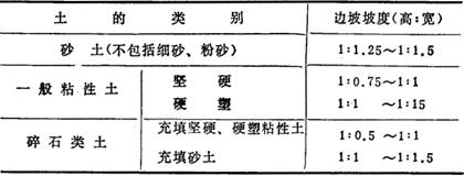 (3)当地质条件良好,土质均匀且地下水位低于基坑(槽)或管沟底面标高时,挖方深度在5m以内不加支撑的边坡最陡坡度应符合表17-99的规定。 表17-99 深在5m以内的基槽(坑)、管沟边坡的最陡坡度(不加支撑)