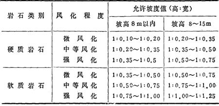 注:①使用时间较长的临时性挖方是指使用时间超过一年的临时道路、临时工程的挖方。 ②挖方经过不同类别的土(岩)层或深度超过10m时,其边坡可作成折线形或台阶形。 ③有成熟施工经验时,可不受本表限制。 (2)岩石边坡容许坡度值(表17-98)。 表17-98 岩石边坡容许坡度