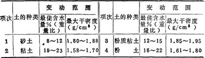 注:压实系数λ为土的控制干密度pd与最大干密度ρdmax的比值。控制含水量为Wop±2。 3)压实的含水量要求(表17-103) 表17-103 土的最优含水量和最大干密度参考表