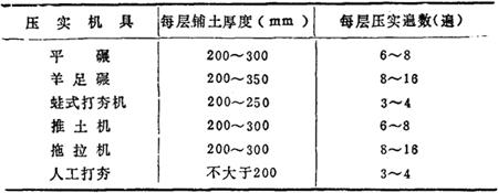 注:人工打夯时,土块粒径不应大于5cm。 5)利用运土工具压实填方时,每层铺土的最大厚度(表17-105)。 表17-105 利用运土工具压实填方时的每层填土的最大厚度(m)