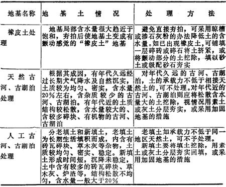 注:1-凿去基岩或坚硬物;2-回填土砂混合料或中粗砂;3-钢筋混凝土板带;4-混凝土或块石砌体支承墙(墩或灌注桩);5-原土;6-基岩;7-回填土。 (4)橡皮土、古河、古湖泊的处理见表17-111。 表17-111 橡皮土。古河、古湖泊的处理