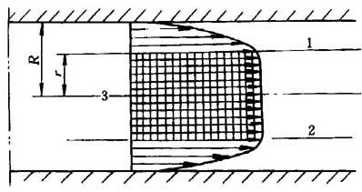 图1-21 圆形管道中的柱塞流动速度分布 1-剪切流动区域 2-剪切流动区域 3-柱塞流动区域 由于柱塞流动中液体受到的剪切小,故塑料液体在流动过程中不容易得到良好的混合,组分均匀性和温度均匀性都差,制品性能降低。这对于多组分塑料材料的挤出成型尤为不利。 由于