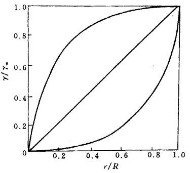 图1-22 服从幂律定律液体剪切速率分布曲线 由式(1-37)与式(1-41)比较可得: