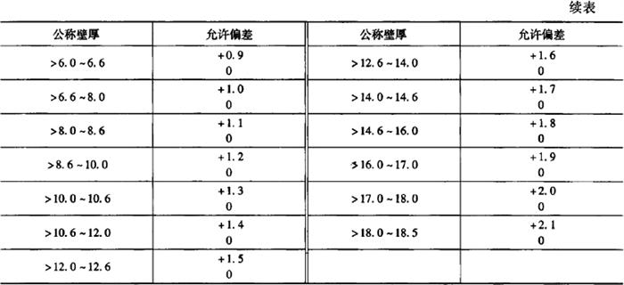 注:1.公称压力PN为管材在20℃时的工作压力; 2.管系列S由设计应力与公称压力之比得出。 5.壁厚偏差(表7-92) 表7-92 埋地给水用聚丙烯管材的壁厚偏差mm