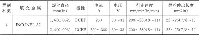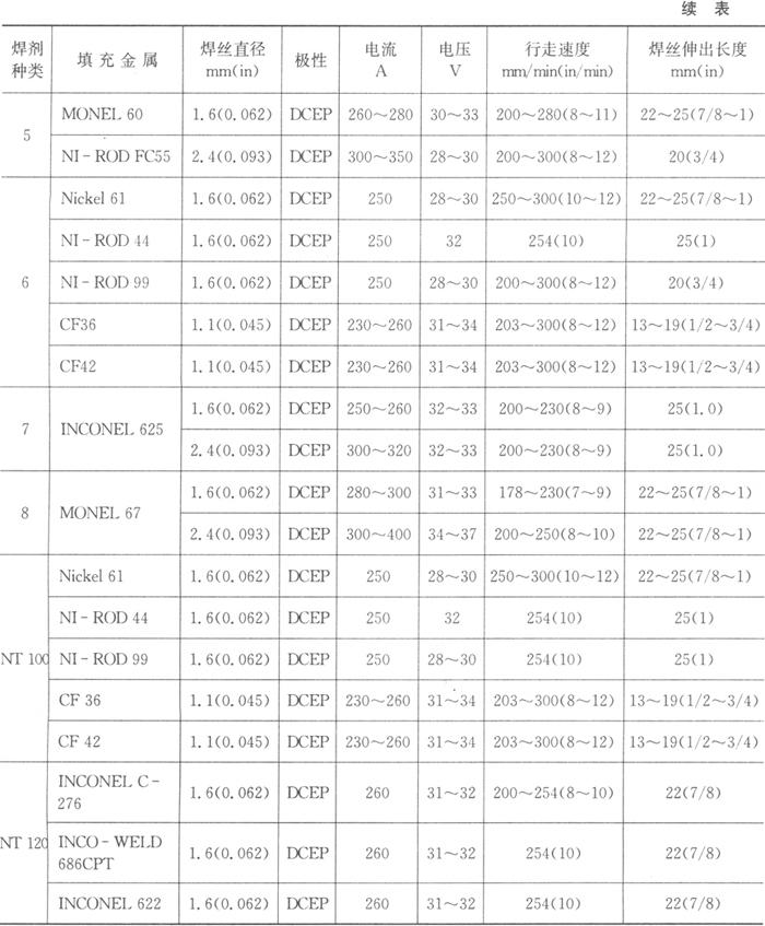 | 释义 | 埋弧焊 在厚件的情况下,可以采用埋弧焊(SAW)。与自动GMAW相比,埋弧焊的熔敷速率要高35%~50%,焊道较厚,电弧稳定,表面光滑,也可用于表面堆焊。 使用合适的焊剂是埋弧焊成功的关键。埋弧焊的填充金属相同于GMAW的焊材。焊丝直径在Φ1.1~2.4mm之间。最佳为Φ1.6mm,厚件采用Φ2.4mm。电流可采用DCEN或DCEP。但一般对接用DCEP,堆焊用DCEN。在不同焊剂/焊丝组合下的焊弧焊典型规范见表5.6-3。 表5.6-3 镍合金埋弧焊典型焊接规范