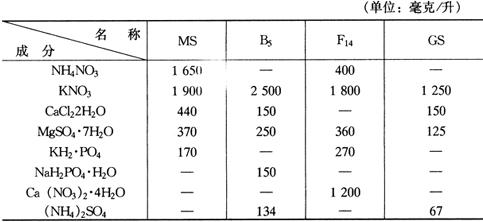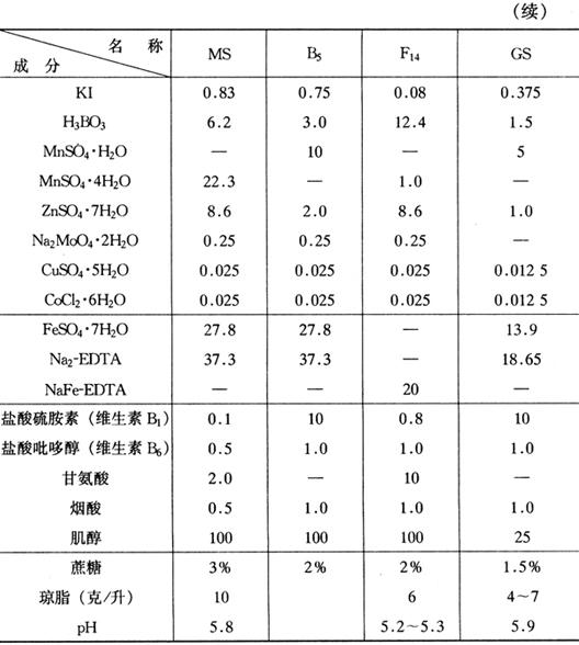 | 释义 | 培养基的制备 培养基是外植体生长的营养物质,是植物组织培养成功与否的关键因素之一(表2-1)。培养基的种类、成分直接影响到培养材料的生长,应根据外植体的种类和部位,选择适宜的培养基。培养基的成分主要包括:无机营养成分(包括大量元素和微量元素),有机营养成分(包括氨基酸、维生素和糖),植物生长调节剂(包括生长素、细胞分裂素、赤霉素等),其他有机附加物(包括一些成分尚不完全清楚的天然提取物,如椰乳、香蕉汁、番茄汁、酸母提取物、马铃薯浸汁等),在固体培养基中还需加入琼脂作为凝固剂。 表2-1 常用培养基成分表