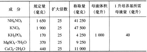 1.器皿和用具的准备 配制培养所用的主要器具有不同型号的三角烧瓶(锥形瓶)、试管、烧杯、培养皿、容量瓶、移液管、滴管、玻璃棒、漏斗、注射器等。各种器皿、用具必须清洗干净后方可使用。新购置的玻璃器皿使用前选用1%稀盐酸浸泡一夜,然后用洗涤剂洗净,清水冲洗干净,最后用蒸馏水冲一遍,干后备用。已用过的器皿应先将残渣去掉,用清水洗净,然后再用洗涤剂洗净,清水冲洗干净,干后备用。移液管、滴管、容量瓶等由于口小不便碱洗,常用酸洗,即用酸液(40克工业用重铬酸钾经少量水溶解,然后缓慢加入粗制浓硫酸至1000毫升)浸泡一天后,取出在流水中冲洗干净后,再用蒸馏水冲一遍,干后备用。 2.母液的配制与保存 配制培养基用的水原则上应用纯水,一般用蒸馏水即可,化学药品用分析纯或化学纯,称量须准确,且应准确记录,以便日后查对。对于常用的培养基,一般先配成10倍或100倍的混合母液,贮存于冰箱内,用时再按比例稀释混合。这样使用方便,也减少工作量。通常大量无机盐类原则上可以混在一起,配成10倍浓度的母液,各种药品必须各自充分溶解后才能混合,混合时要注意先后次序,要把钙离子(Ca2+)、锰离子(Mn2+)、钡离子(Ba2+)和硫酸根(SO42-)、磷酸根(PO43-)错开,以免形成硫酸钙、硫酸钡、磷酸钙或磷酸锰沉淀。铁盐也容易发生沉淀,需要单独配制。一般用硫酸亚铁(FeSO4·7H2O)和乙二胺四乙酸二钠(Na2-EDTA)配成200倍浓度的铁螯合剂,比较稳定,不易沉淀。微量元素和维生素之类可配成100倍浓度的混合母液。各种母液配好之后,于冰箱内贮存备用。现以MS培养基为例,具体讲述母液的配制方法。 (1)大量元素母液 参照表2-2,按次序进行称量、溶解、配制。配好的母液贴上标签注明母液名称,扩大倍数、日期、及配制1升培养基时应取的量。于2~4℃冰箱内贮存,最好于1个月内用完。如发现有霉菌和沉淀产生,则不能再使用。 表2-2 MS培养基大量元素母液配制法