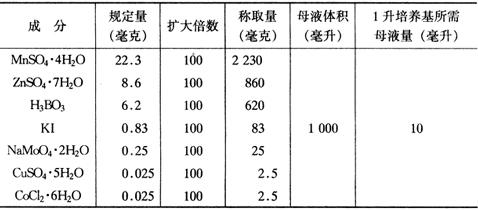 (2)微量元素母液 微量元素用量小,为称量方便及精确起见,可配成100倍母液。参照表2-3顺序称量,分别溶解后,依顺序混合,并定容于1000毫升的容量瓶中。 表2-3 MS培养基微量元素母液配制法