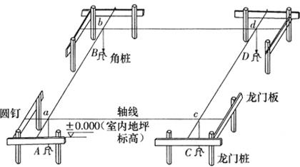 图1-32 龙门板的设置 在设置龙门板时,应按照以下步骤和要求进行: (1)在建筑物四角与建筑物内纵、横墙两端基槽开挖边线以外约1~1.5m处钉设龙门桩,具体位置应根据土质情况和基槽开挖深度而确定,龙门桩要固定竖直、牢固,木桩的侧面要与基槽平行。 (2)根据建筑施工场地的水准点,在每个龙门桩上测设±0.00(或+0.50~1.0m)标高线,并沿此标高线钉龙门板。 (3)根据轴线桩,用经纬仪将墙、柱的轴线投到龙门板顶面上,钉上小铁钉加以标明,并在轴线的延长线上钉控制桩,如图1-33所示。
