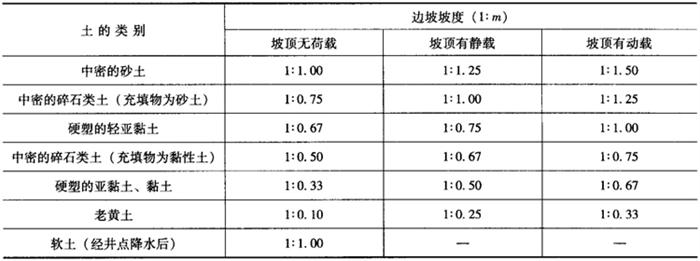 注:1.静载指堆土或其他材料等,动载指机械挖土或汽车运输作业等。静载或动载距挖方边缘的距离,应符合规范中的有关规定。 2.当施工单位有成熟的施工经验时,可以不受本表的限制。 |