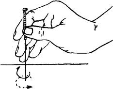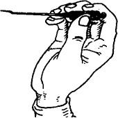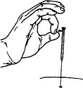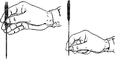 图1.3.1-2 毫针的持针法 2.圆利针的持针法 与地面垂直进针时,以拇、食指夹持针柄,以中指、无名指抵住针身(图1.3.3)。与地面水平进针时,则用全握式持针法,即以拇、食、中指捏住针体,针柄抵在掌心(图1.3.4)。进针时,可先将针尖刺至皮下,然后根据所需的进针方向,调好针刺角度,用拇、食、中指持针柄捻转进针达所需深度。