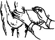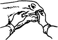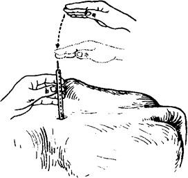 图1.3.15 提捏押手法 (三)进针法 针刺时依所用的针具、穴位和针治对象的不同,可采用不同的进针方法,常用的有缓刺与速刺两种。 1.捻转进针法 毫针、圆利针多用此法。操作时,一般是一手切穴,一手持针,先将针尖刺入穴位皮下,然后缓慢捻转进针。如用细长的毫针可采用骈指押手法辅助进针。 2.速刺进针法 多用于宽针、火针、圆利针、三棱针的进针。用宽针时,使针尖露出适当的长度,对准穴位,以轻巧敏捷手法,刺入穴位,即可一针见血。用火针时,则可一次刺入所需的深度,再作短时间的留针。用圆利针时,可先将针尖刺入穴位皮下,再调整针向,随手刺入。 3.飞针法 类似于速刺进针法,适用于不太老实的患畜。其特点是不用押手,以刺手点穴并施针;辅助动作多,能分散患畜注意力;进针速度快,可减轻进针时的疼痛;针刺入穴位后患畜多安然不动,或略有回避动作。具体操作分三步,即“一呼、二拍、三扎针”。 一呼,即术者接近患畜时,高声呼号(按地区习惯呼“得儿……”或“吁……”),使病畜消除戒心,然后左手在患畜适当部位按握,作为支点;右手持针,用手背抚摸畜体,并趋向穴位,再用无名指正确取穴定位。二拍,随着呼号,以刺手的指背轻拍穴位一下,患畜受到了轻微的振动,但不痛不痒,注意力进一步分散。三扎针,刺手轻拍穴位后,随即翻手进针,一次刺入所需深度。上述三步要连贯而行,紧密衔接,全部施针过程仅需几秒钟完成,故有“飞针”之称。 4.管针进针法 主要用于短针的进针。将特制的针管置于穴位上,把针放入管内,用右手食指或中指弹击或叩击针尾,将针刺入皮内。然后退出针管,再将针捻入或直接刺入穴中(图1.3.16)。