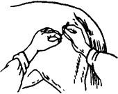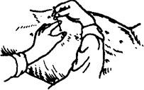 图1.3.11 三弯针持针法 (二)按穴(押手)法 针刺时多以左手按穴,称为押手。其作用是固定穴位,辅助进针,使针体准确地刺入穴位。还可减轻针刺的疼痛。常用押手法,有下列四种。 1.指切押手法 以左手拇指指甲切压穴位及近旁皮肤,右手持针使针尖靠近押手拇指边缘,刺入穴位内。适用于短针的进针(图1.3.12)。