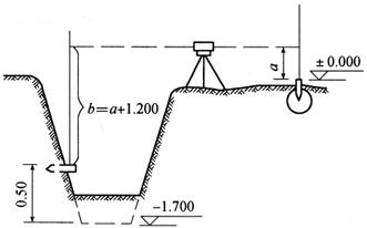 | 释义 | 基础施工测量 1.基槽开挖边线放线与水平桩的测设 (1)基槽开挖边线放线 在基础开挖之前,应按照基础详图上的基槽宽度再加上口放坡的尺寸,由中心桩向两边各量出相应尺寸,并作出标记;然后在基槽两端的标记之间拉一细线,沿着细线在地面用白灰撒出基槽边线,施工时就按此灰线进行开挖。 (2)测设水平桩 为了控制基槽开挖深度,在即将挖到槽底设计标高时,用水准仪在槽壁上测设一些水平的小木桩(图10-16),使木桩的上表面离槽底设计标高为一固定值(如0.500m),用以控制挖槽深度。为了施工时使用方便,一般在槽壁各拐角处和槽壁每隔3~4m处均测设一水平桩,水平桩可作为挖槽深度、修平槽底和打基础垫层的依据。水平桩高程测设允许误差为±10mm。如图10-16所示,假设槽底设计标高为-1.700m,按图中所列数据,测站上应有的前视读数为a+1.200(a为后视读数),此时打水平桩,则水平桩的标高即为-1.200m。施工时,自水平桩面向下量取0.500m即为槽底的设计位置。