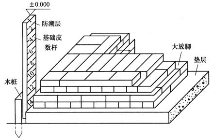 图10-17 基础垫层中线的测设 (2)基础墙标高的控制 基础墙是指±0.00以下的墙。当墙中心线投在垫层上,用水准仪检测各墙角垫层面标高后,即可开始基础墙的砌筑。基础墙的高度是用基础皮数杆控制的。 皮数杆用一根木杆制成,在杆上按照设计尺寸将砖和灰缝的厚度,分皮一一画出,每五皮砖标注上皮数(基础皮数杆的层数从±0.000向下注记),并标明±0.000、防潮层和需要预留洞口的标高位置等,如图10-18所示。立皮数杆时,可先在立杆处打一木桩,用水准仪在木桩侧面定出一条高于垫层标高某一数值(如10cm)的水平线;然后将皮数杆上标高相同的一条线与木桩上的水平线对齐,并用大铁钉把皮数杆与木桩钉在一起,作为基础墙砌筑标高的依据。