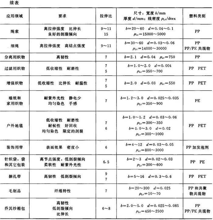| 释义 | 塑料扁丝的特性及其应用 扁丝的性能(特别是韧度、伸长率和热收缩量)取决于挤出的冷却方式、冷却程度与取向度。目前,塑料扁丝几乎完全取代了相关领域中的天然产品。表11-8列举了扁丝的常规应用和对产品的主要要求、常规的拉伸比、通常的尺寸和塑料类型。 表11-8 塑料扁丝的应用领域和主要要求