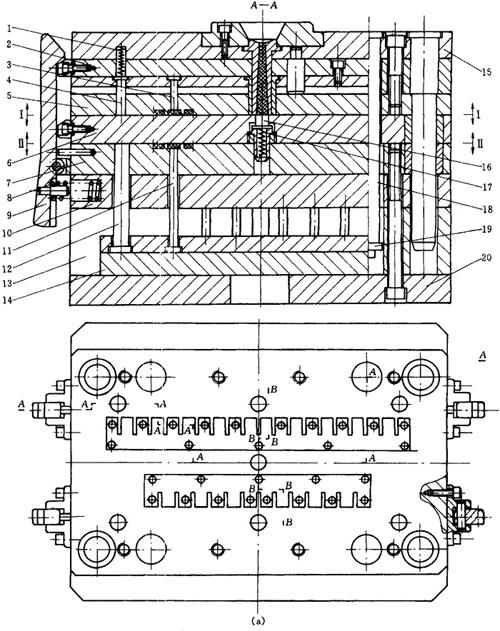| 释义 | 塑料隔板注射模具 该模具用以成型四种规格的隔板制品。模具结构采用双分型面。定模型腔成型窄的制品,由侧浇口进料;动模型腔成型宽的制品,由点浇口进料。此模具为点浇口进料的三板式模具。 开模时,Ⅰ-Ⅰ面首先分型,在此过程中,在摆钩9和弹簧1的同时作用下,由推杆3将窄制品顶出定模板5型腔;然后,在继续开模中,摆钩9被强行脱开,窄制品和浇口随浇口板6一起移动,当摆钩9钩住浇口板6时,在弹簧17作用下,推杆16将点浇口顶断,窄制品同时脱开浇口板6。当浇口板6由垫圈19限位后,摆钩9再次被强行脱开,此时模具沿Ⅱ-Ⅱ面分型,随后推杆11将宽制品从动模板7中顶出,见图5-15。
