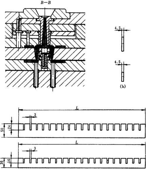 图5-15(b) 塑料隔板注射模具侧视图及塑件图 1—弹簧 2—推板 3—推杆 4—复位杆 5—定模板 6—浇口板 7—动模板 8—弹簧 9—摆钩 10—支承板 11—推杆 12—复位板 13—垫块 14—推板 15—定模镶块 16—推杆 17—弹簧 18—拉杆 19—垫圈 20—动模座板 |