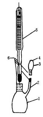 图10-2-4 比重瓶 1-比重瓶主体 2-侧管 3-侧孔 4-罩 5-温度计 6-玻璃磨口 测定要点:将20℃蒸馏水(经煮沸30min)注满瓶中,装上温度计(瓶中应无气泡),立即浸入20±0.1℃恒温水浴中20~30min,取出,用滤纸擦去溢出侧管之水,立即盖上罩擦干后称量G3。 将比重瓶中水倾出,用乙醇、乙醚洗涤数次,吹干后称量G1,将试样注满比重瓶,按上述恒温至20±0.1℃,称量G2。 计算公式: