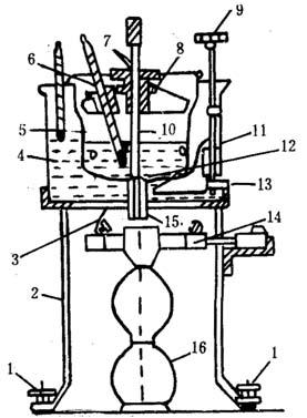 图10-2-7 恩氏粘度计 1-调整螺钉 2-铁三角架 3-铂制角 4-外容器 5-内容器 6-插温度计孔 7-木塞孔 8-黄铜盖 9-搅拌手柄 10-柱塞 11-小尖钉 12-流出孔 13-搅拌器 14-环焰灯 15-黄铜小管 16-瓶 试剂:乙醇,蒸馏水。 试验方法:将试样注入容器,调整至三个尖钉的尖端刚露出液面为止。接通电源,以变压器调节升温速度。不停搅拌内外容器液体,要求外容器内液体温度比内容器液体高1℃,当试样达到所需温度时迅速提起柱塞同时按下秒表。记下从内容器流出液体达到接受瓶的200m1刻度线时的秒数。 蒸馏水的测定方法同上,标准粘度计的水值为51±1s。 计算公式: 绝对粘度(Cp)=7.41×恩氏粘度 ×试样相对密度(20℃)