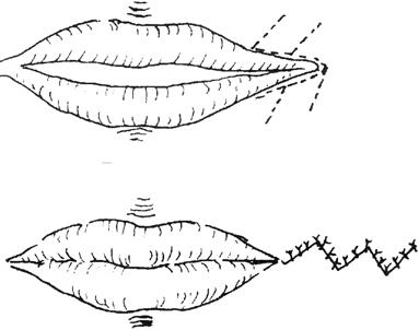 图15-8 大口畸形“Z”成形术 (2)自口裂唇缘定点处,沿裂隙的上、下唇皮肤与唇红交界处做切口,并在切口上、下的皮肤上做附加切口。 (3)沿唇缘切口切透皮肤和肌肉层,附加切口只切到皮下。 (4)将创缘的唇红黏膜内翻缝合作口腔黏膜。 (5)缝合上、下唇唇缘口轮匝肌,附加切口做对偶三角瓣移位交叉缝合。 【注意事项】 (1)肌肉缝合要严密,以免影响口角外观。 (2)口内黏膜切口和口外皮肤切口,不应在一个平面上(术式1)。 (3)从皮肤切至肌层时勿切透黏膜,以便使其作口内衬里(术式2)。 (4)口腔裂隙较短者可切开黏膜、肌肉、皮肤后,直接对应缝合(术式2)。 (5)术后要用绷带包扎,限制张口活动。 【并发症及其处理】 (1)切口感染,由于局部消毒不严和术后污染所致。处置同前。 (2)肿胀明显,由于唇部组织疏松易肿胀。可术后冷敷2~3d,减轻肿胀。 (3)术后瘢痕。一般不明显,尤其是术式2。 (4)术后缝合口凹陷。由于术中肌层缝合不严所致。术中肌层对位缝合时尽量不留间隙。 |