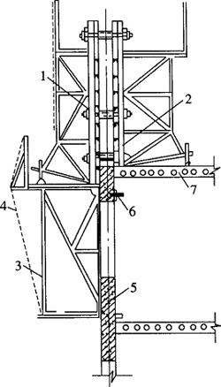 图9-19 悬挑式外模板示意图 1-外墙外模板;2-外墙内模板;3-外墙内模板 2)外承式外模板施工。当采用外承式外模板施工时,可将外墙的外模板安装在下层混凝土外面上挑出的支撑架上,如图9-20所示。支撑架可制成三角架,用L型螺栓通过下一层外墙预留孔挂在外墙上。为了保证安全,要设防护栏杆和安全网。外墙的外模板安装好后,再安装内墙模板和外墙外模板。