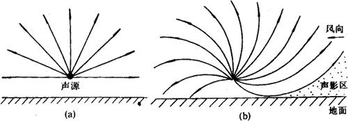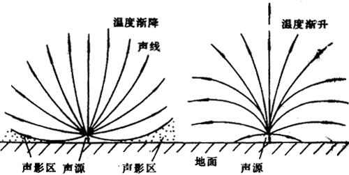 | 释义 | 大气中的声折射 大气虽然是声波的同一种媒质,但由于受温度和风的影响,各处特性会有不同。将引起声折射,现分别讨论如下: (1)因风速引起: 人们日常会感觉到,当刮风较大时,在地面上顺风听声音要比逆风容易。 刮风时由于地面上万物的摩擦阻力,接近地面的风力逐渐降低,这样会破坏波阵面。假定靠近地面有一声源,在无风时它的波阵面为系列的同心球面。如〔11.2-1a〕所示。但刮风时,波形上端的移动要比低处的快,因此波阵面不再为圆球,而是如(b)所示那样受到了破坏。由于波阵面上任何一点的传播方向皆垂直于波阵面,故有风时顺风的声线的方向朝下弯曲,而逆风时的声线方向朝上弯曲。因此在地面上,声源的听者要比右方向的方便。右方的有时甚至根本听不到。