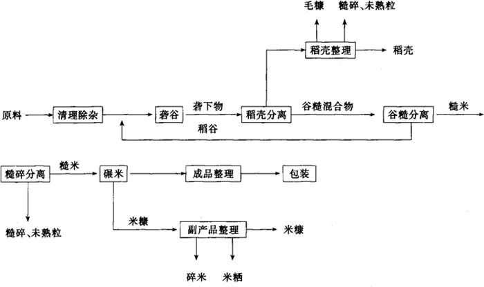 | 释义 | 大米加工装备 1 概述 大米是以稻谷为原料加工而成的粮食,大米加工装备则是将稻谷加工成大米的装备。由于我国稻谷产量居世界第一位,全国约有2/3的人以稻谷为主食,因此,稻谷加工工业在我国占有相当重要的地位。 由于稻谷种类不同,大致可分为籼稻谷、粳稻谷、籼糯谷和粳糯稻谷四类。虽然各种稻谷的形态结构有一定差异,但在加工过程中都要经过清理除杂、砻谷、谷糙分离、碾米及成品处理等工序。 本节重点介绍大米加工的工艺流程和其中具有代表性的关键设备。目前,在国内外大米加工装备已成套,并有较高水平。 2 大米加工工艺流程(图1-2-1)