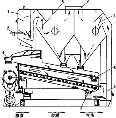 图1-2-2 振动筛结构示意图 1-进料斗 2-压力活门 3-进口吸风道 4-大杂质出口 5-中杂质出口 6-出口吸风道 7-小杂质出口 8,9-风量调节活门 10-吸风口 工作过程:稻谷进入进料斗1后,借压力活门2的作用,沿筛面宽度均匀地流入进口吸风道3,除去部分轻杂和灰尘后,进入第一筛面,筛上物为大型杂质,筛下物落到第二层筛面,筛上物为中型杂质,筛下物继续流到第三层筛面上,再分离小杂质,此时粮粒成为筛上物,在出口吸风道6经第二次吸风处理流出机外。穿过第三层筛孔的小杂质则从小杂质出口7排出。清理出的各种下脚中不应含有完整的粮粒。振动筛是一种除杂效率较高的清理设备。 3.1.2 高速筛(图1-2-3) 高速筛主要用于清除稻谷在收割时混入的稗子,它的振动频率比振动筛要高得多,一般在1500次/min左右。它具有结构紧凑、流程简短、筛孔不易堵塞等特点。其标准系列为单进口(500mm,630mm,800mm)和双进口(800mm×2,1000mm×2,1250mm×2)两个通用范围。处理量从1.0~5.8t/h不等。