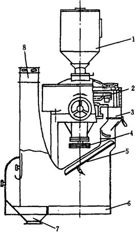 图1-2-5 胶辊砻谷机 1-进料斗 2-喂料淌板 3-谷壳排出口 4-慢辊 5-快辊 6-缓冲槽 7-谷壳分离装置 8-谷糙混合物出口 胶辊砻谷机是借助于一对相向转动,但有一定速度差的胶辊,在胶辊的压力下,对稻谷进行挤压和搓撕达到脱壳的目的,工作时稻谷由进料斗1通过喂料淌板2进入两橡胶辊筒之间进行脱壳,脱壳后的混合物在砻谷机底座的谷壳分离装置7中分离出谷壳,谷壳由吸风管排出。 3.2.2 砂盘砻谷机(图1-2-6) 砂盘砻谷机俗称砂砻。它具有结构简单、取材方便、造价低廉、砂盘能自行烧制等特点。