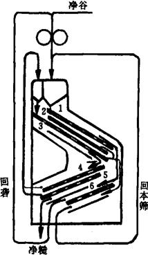 图1-2-6 砂盘砻谷机 1-进料斗 2-砂盘 3-连接斗 4-传动机构 5-谷壳分离装置 6-机架 7-谷糙混合物出口 8-谷壳排出口 砂砻主要由进料斗、砂盘、轧距调节机构、传动机构和谷壳分离装置等部分组成。主要工作机构是上、下两个平卧的砂盘。工作时,上盘固定不动,下盘作平面旋转运动。当谷粒由上砂盘中心进料斗1落入转动的下砂盘2时,在惯性离心力的作用下,便迅速进入金刚砂盘工作区(轧距)内。由于谷粒本身惯性离心力和下砂盘摩擦力的作用,使谷粒受到摩擦、挤压、剪切、搓撕等综合作用力,使谷壳破裂、脱离。脱壳后的混合物经连接斗3流入底部的谷壳分离装置5,分离出谷壳,并从垂直风道谷壳排出口8吸走。谷糙混合物由出料口排出机外。 与胶砻比较,其作用力强,对谷粒损伤较大,在许多地方逐渐被胶砻取代。 砂盘工作表面性状对稻谷的脱壳率及碎米率有很大影响,所以一般采用不同粒度的金刚砂按一定比例混合。 3.3 谷糙分离装备 3.3.1 选糙溜筛(图1-2-7) 选糙溜筛具有结构简单、造价低、制作方便、不需动力等优点。但由于所需设备多、筛面多、筛理路线长、筛理效率低、占用厂房面积大、回流量大等缺点,不适用于原粮品种多变和采用气力输送的米厂。图1-2-7所示为6层筛面组成的多层谷糙分离溜筛的工艺流程图。筛体上装有双向螺杆式的筛面调节机构,用以调节筛面倾角。