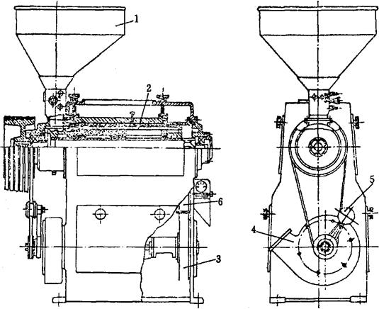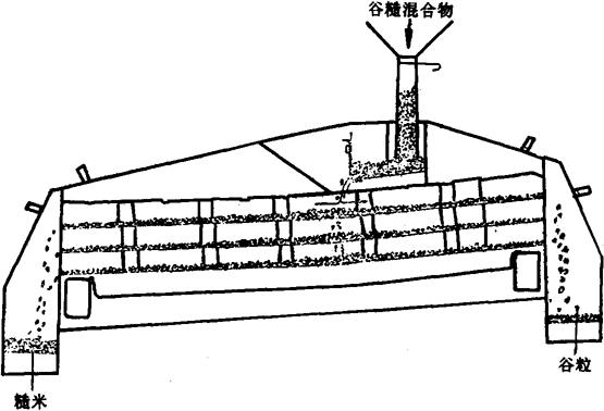 图1-2-9 可变冲程巴基机工作原理图 3.3.4 袋孔式振动谷糙分离机 袋孔式振动谷糙分离机又称摇动谷糙分离机。该机由进料装置、袋孔分选台、传动机构、筛面角度调节机构和机座等主要部件组成。 工作时,由于稻谷与糙米之间存在着相对密度、粒度及摩擦因数的不同,在分选面上摇动两种混合物的谷物层。当谷粒间开始产生相对运动时,相对密度大而粒度小的糙米则沉于谷物层下方,而稻谷却浮于上方。糙米在分选面的直接推动下移向分选面上方,占据着分选面的上方位置,而上层的稻谷滑向下方占据分选面的下方位置。另外,分选面凹凸孔的大小适合糙米进入,而稻谷难于进去。这种形状阻碍糙米向分选面下方流动,促使谷糙分离。 3.4 碾米装备 3.4.1 铁辊筒碾米机(图1-2-10) 铁辊筒碾米机具有结构简单、操作方便、造价低、用途广泛等特点。但该机加工籼米时,碎米较多,出米率较低,所以在农村的稻谷加工厂里应用比较广泛,在城市里则应用较少。