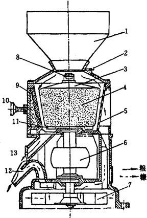 图1-2-11 立式金刚砂碾米机的结构简图 1-进料斗 2-进料插板 3-压盖 4-砂臼 5-米筛 6-皮带轮 7-风机叶轮 8-螺母 9-橡胶米刀 10-调节手轮 11-拨翅 12-吸风口 13-米粒出料口 工作时,糙米由进料斗1通过进料插板2进入砂臼4的压盖3部分,在石砂臼运转所产生的离心力作用下,被排入砂臼与米筛5所构成的碾白室内,由于砂臼的碾削作用,糠层被碾除。碾白的米粒在砂臼下的拨翅11处汇集,并从米粒出料口13排出。被碾下的糠层穿过米筛5筛孔,经米机的空心柱脚,由底部风机叶轮7吸入排出机外。米粒由出口排出机外时,也受到吸风的作用,可将混入的糠片吸走。 3.4.3 喷风碾米机(图1-2-12) 在加工高精度大米时可以采用该机。其结构特点为:将喷风机置于机内大米出口一侧,结构紧凑。