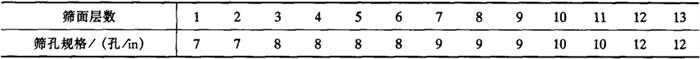 图1-2-14 白米分级平筛及其分级流程 从分级流程图上看,其各层筛面的规格尺寸如表1-2-1所示。其中1~2层规格相同,3~6层规格相同,7~9层规格相同,10~11层规格相同,12~13层规格相同。分级时白米进入1层、2层筛面,筛下物顺次穿过通道下流,而1层筛上物进入4层筛面,2层筛上物进入3层筛面。最后3层、4层筛上物得到全整米。从4层出来的筛下物落到第5层筛面。仍然是筛下物顺次经通道下流,5~9层筛面依次两两相通,到第9层筛过筛后得到的筛上物为整米。第10层和第11层筛筛面相通,10层的筛上物继续到11层过筛,得到的筛上物为大碎米,两层的筛下物则由通道落至12层筛面。同样,12层与13层筛面相通,12层的筛上物继续到13层筛面过筛,筛下物由通道集中流出得到小碎米,筛上物为中碎米。 表1-2-1 筛孔规格表